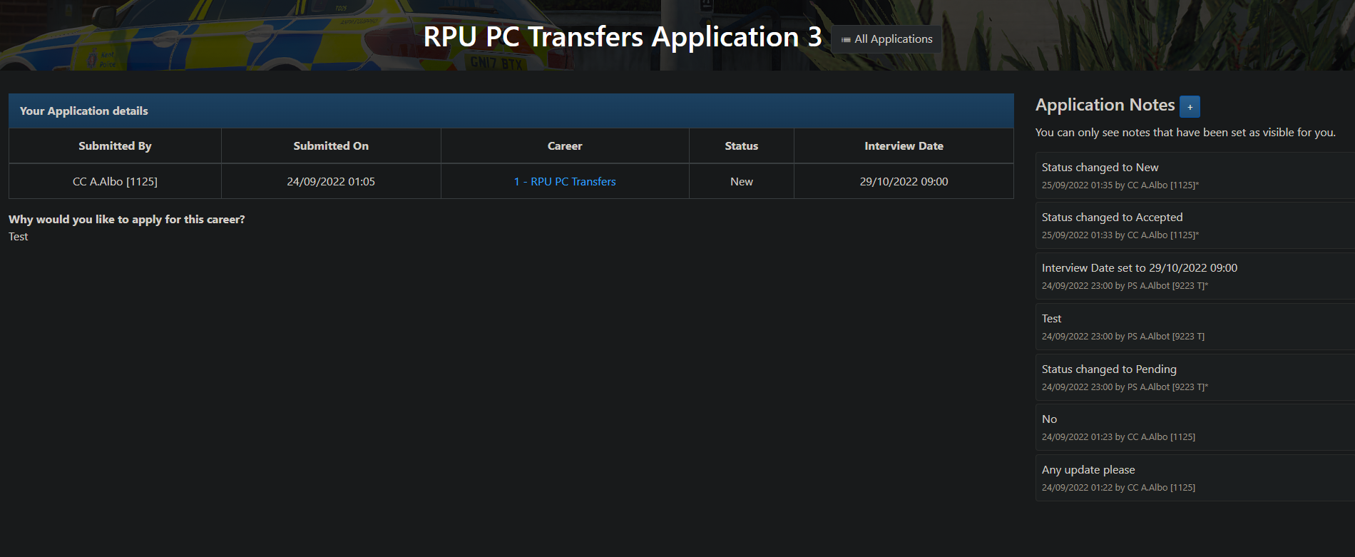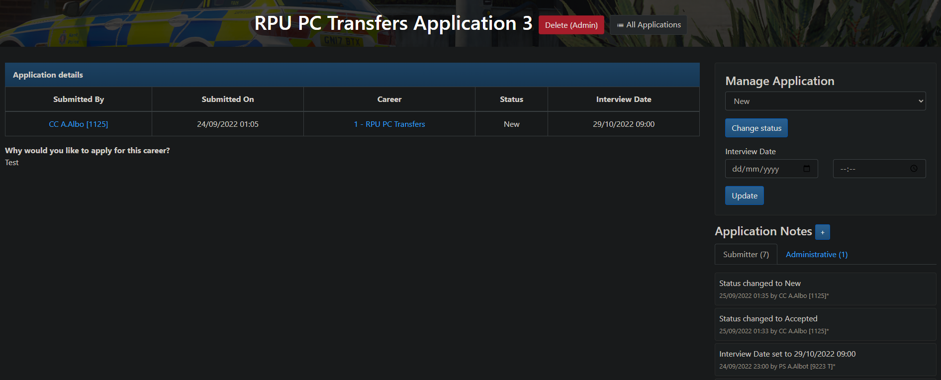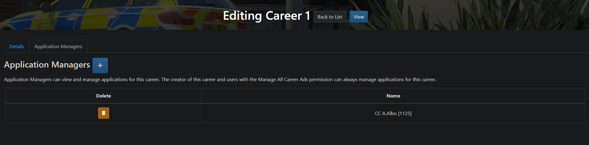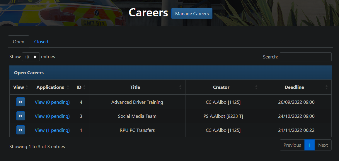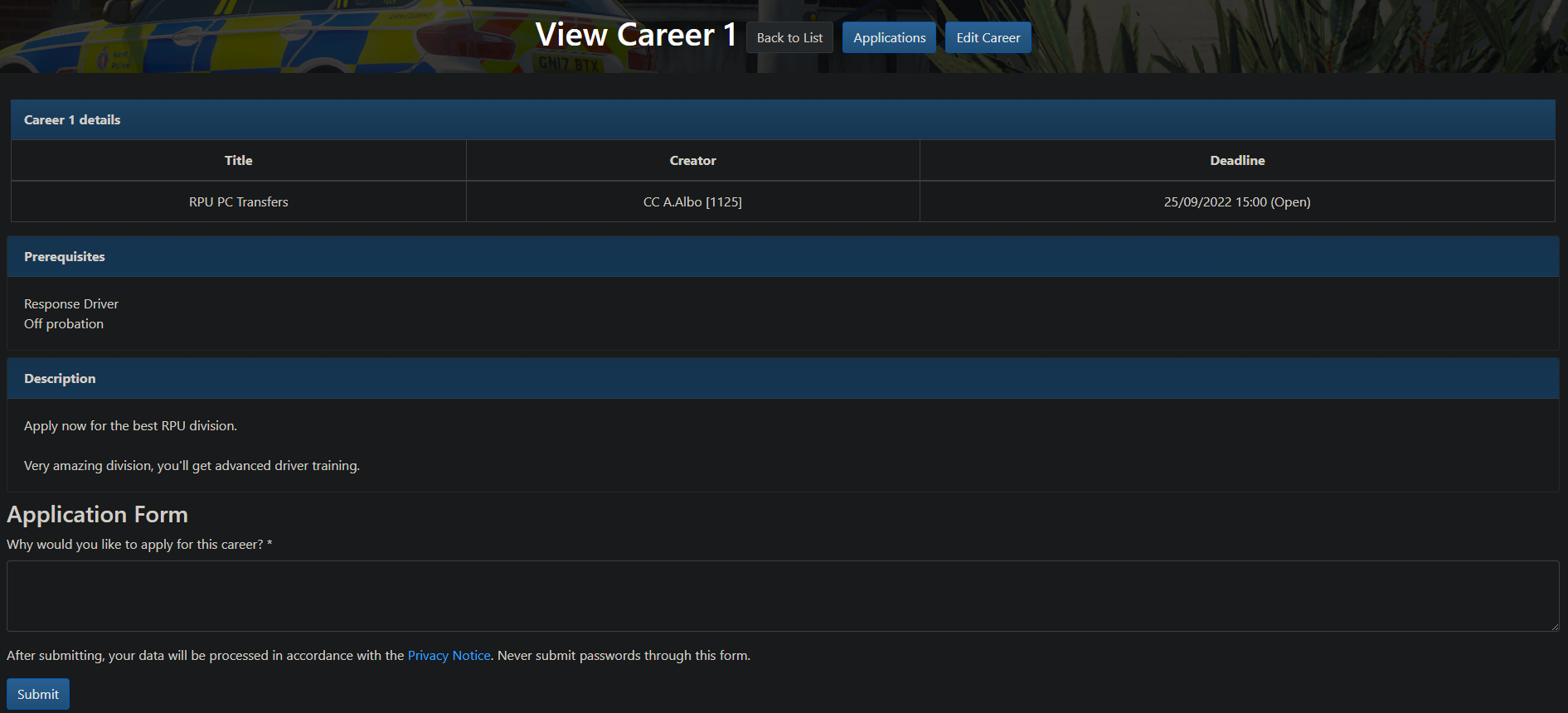 Careers advertising and applications for members (£40), for example for divisional/role leads & applications. These can be managed and customised directly by the appropriate career manager without them having to be given access to all forms. Click an image below to enlarge.