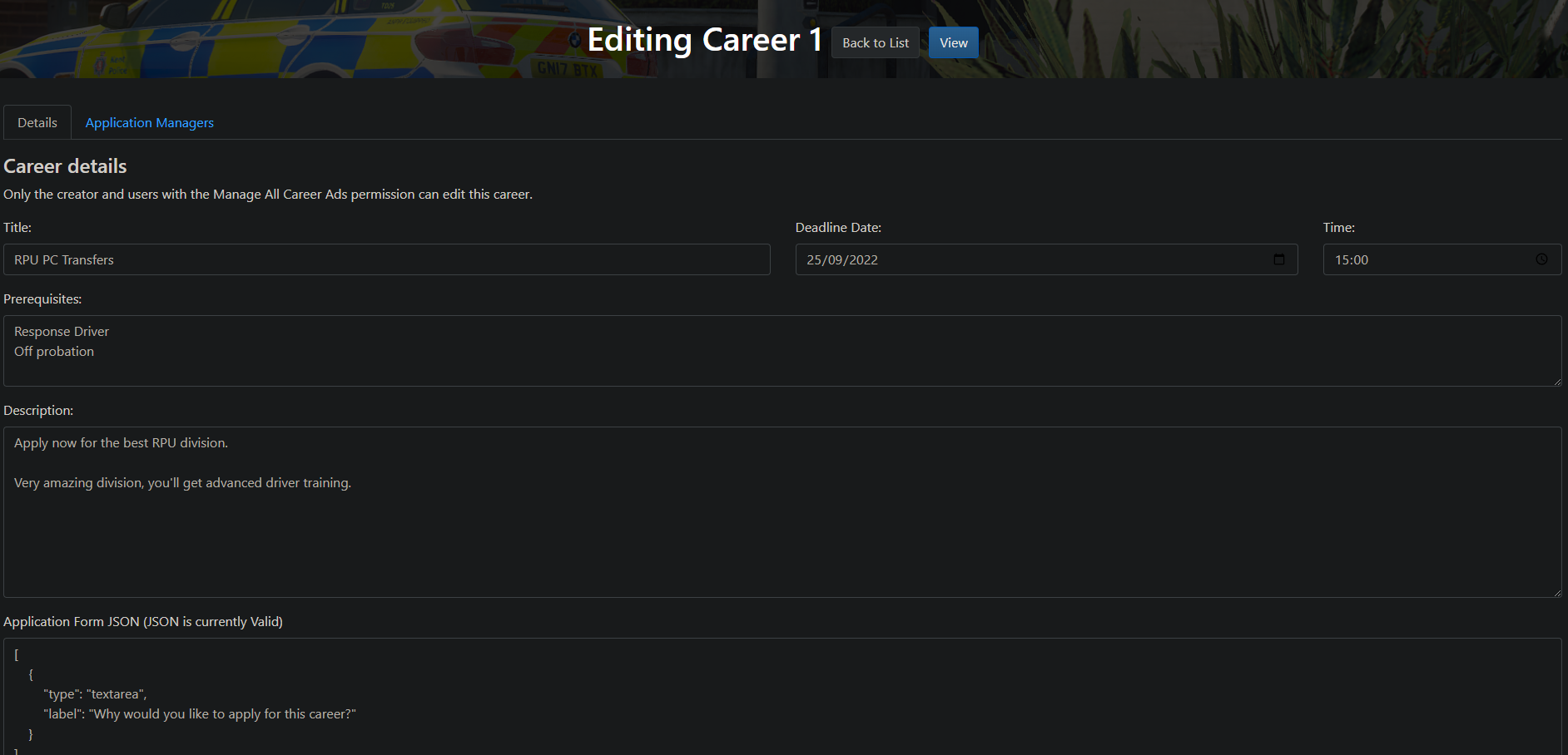 Careers advertising and applications for members (£40), for example for divisional/role leads & applications. These can be managed and customised directly by the appropriate career manager without them having to be given access to all forms. Click an image below to enlarge.